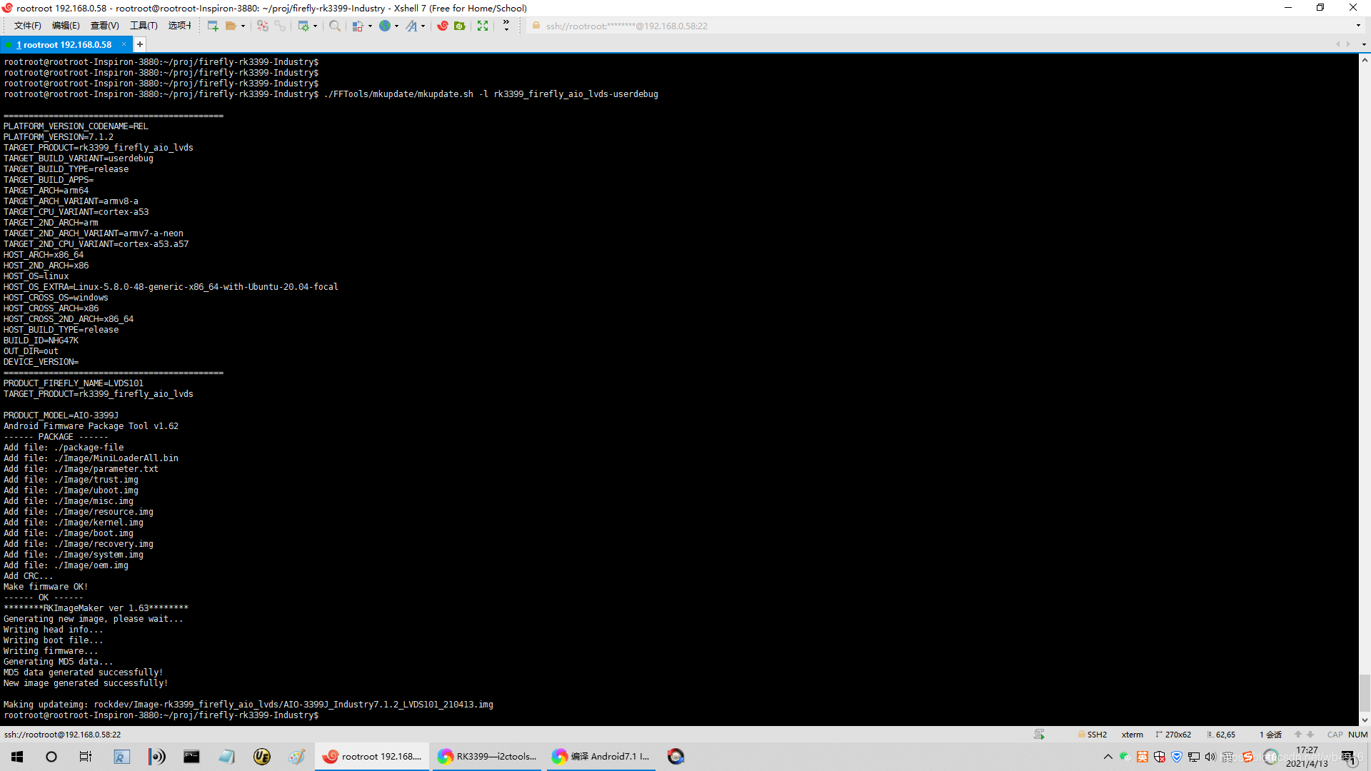 source build/envsetup.sh lunch rk3399_firefly_aio-userdebug make -j8 ./mkimage.sh 打包成统一固件 update.img 编译完可以用Firefly官方的脚本打包成统一固件,执行如下命令:./FFTools/mkupdate/mkupdate.sh update